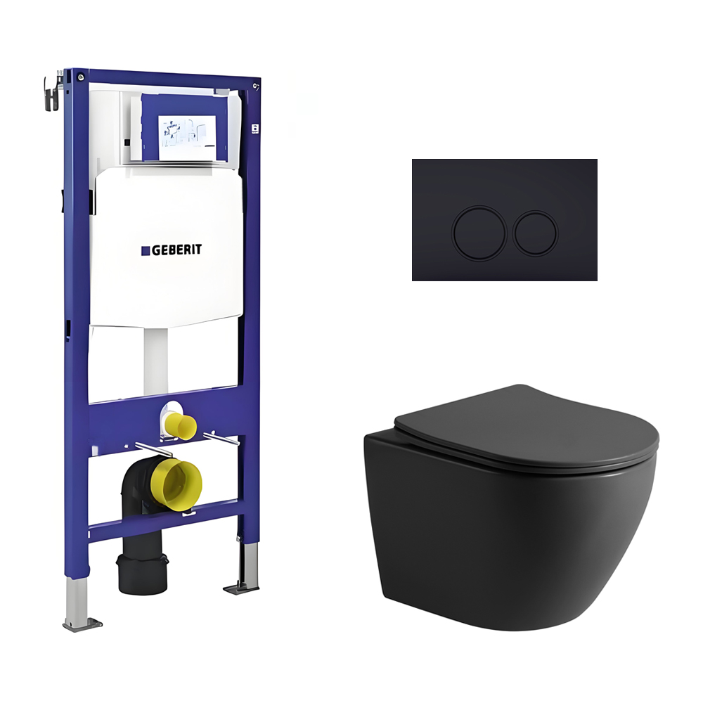 Toiletset Pietro randloos mat zwart met bedieningspaneel Ring mat zwart en Geberit Duofix WC-element (UP320)