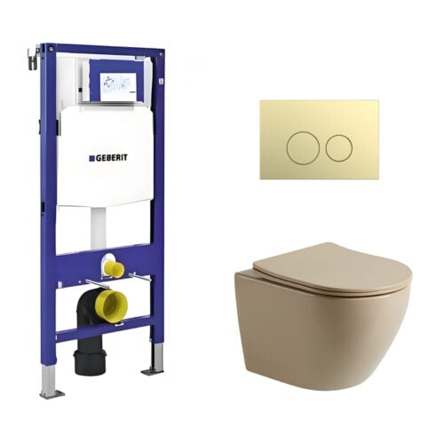 Toiletset Pietro tornado flush mat beige met bedieningspaneel Flat mat goud RVS en Geberit Duofix WC-element (UP320)