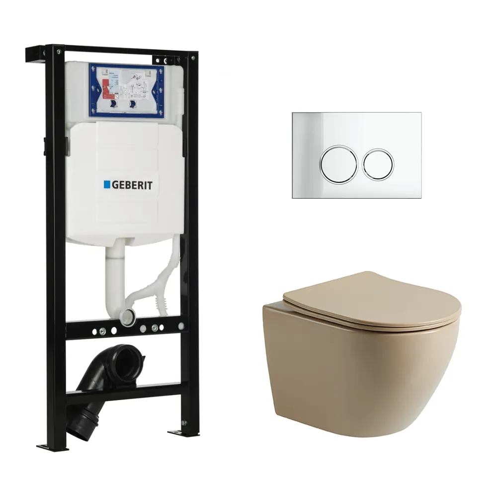 Toiletset Pietro tornado flush mat beige met bedieningspaneel Ring chroom en Plieger Duofix WC-element (UP320)