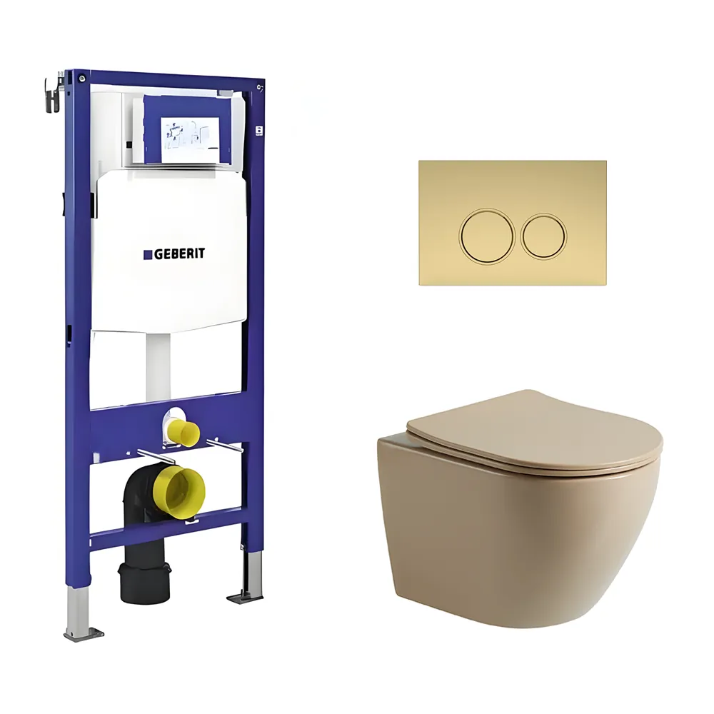 Toiletset Pietro tornado flush mat beige met bedieningspaneel Ring mat goud en Geberit Duofix WC-element (UP320)
