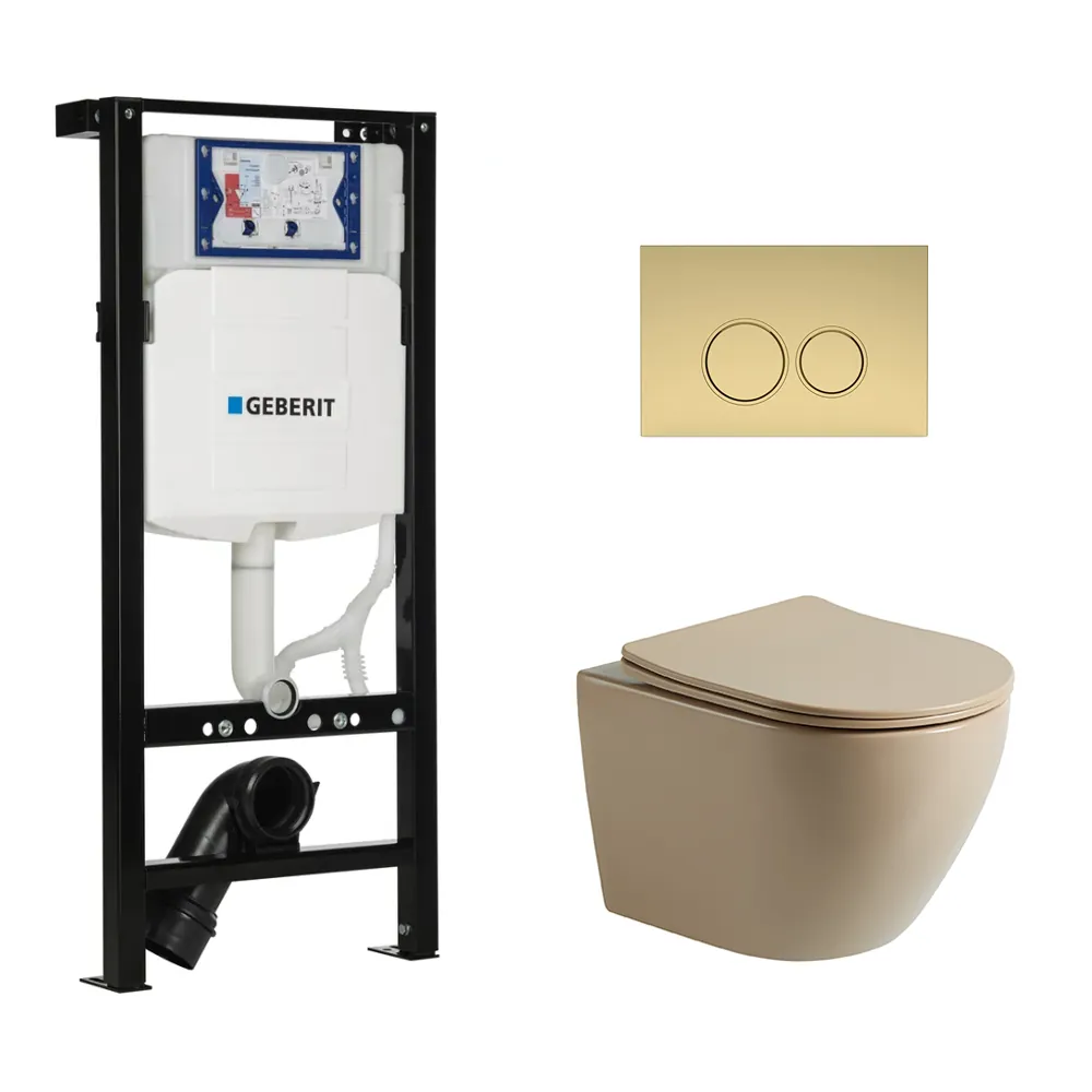 Toiletset Pietro tornado flush mat beige met bedieningspaneel Ring mat goud en Plieger Duofix WC-element (UP320)