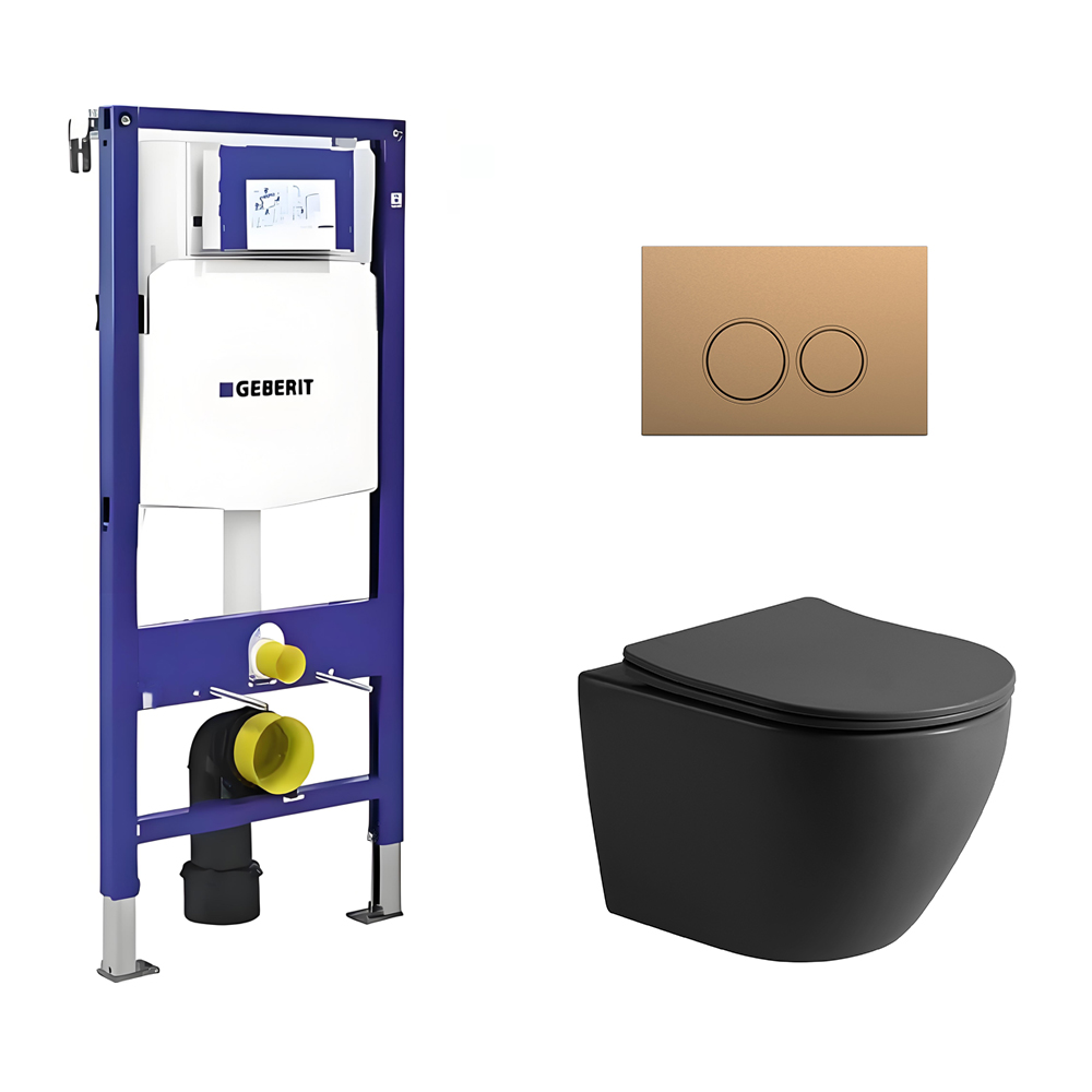 Toiletset Pietro tornado flush mat zwart met bedieningspaneel Ring copper en Geberit Duofix WC-element (UP320)