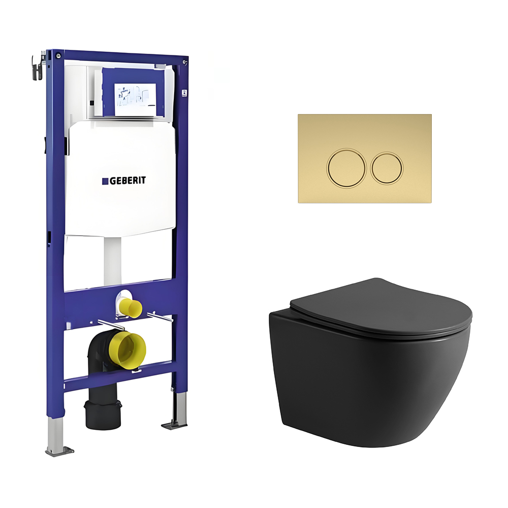 Toiletset Pietro tornado flush mat zwart met bedieningspaneel Ring mat goud en Geberit Duofix WC-element (UP320)