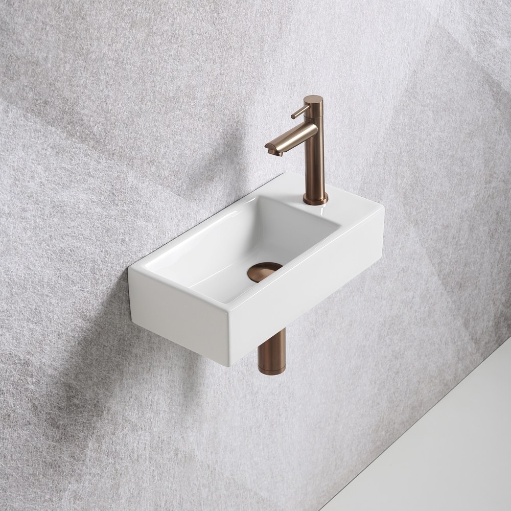 Fonteinset Mia 40.5x20x10.5cm glans wit rechts inclusief fontein kraan, sifon en afvoerplug copper is ontworpen om een strakke en moderne look te geven aan uw toilet. De vierkante fontein is gemaakt van hoogwaardig keramiek dat is afgewerkt met een coating waardoor zowel vuil als kalk niet makkelijk kan hechten. De fonteinkraan copper één-greeps bediening is voorzien van keramisch schijven zodat het verplaatsen van de hendel soepel en hoogwaardig aanvoelt.