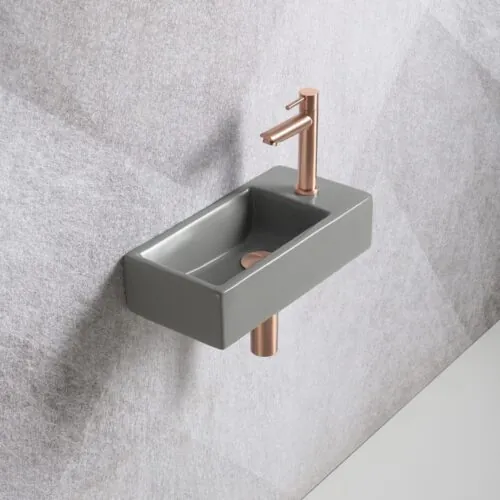 Fonteinset Mia 40.5x20x10.5cm mat grijs rechts inclusief fontein kraan, sifon en afvoerplug mat rose goud is ontworpen om een strakke en moderne look te geven aan uw toilet. De vierkante fontein is gemaakt van hoogwaardig keramiek dat is afgewerkt met een coating waardoor zowel vuil als kalk niet makkelijk kan hechten. De fonteinkraan mat rose goud één-greeps bediening is voorzien van keramisch schijven zodat het verplaatsen van de hendel soepel en hoogwaardig aanvoelt.