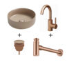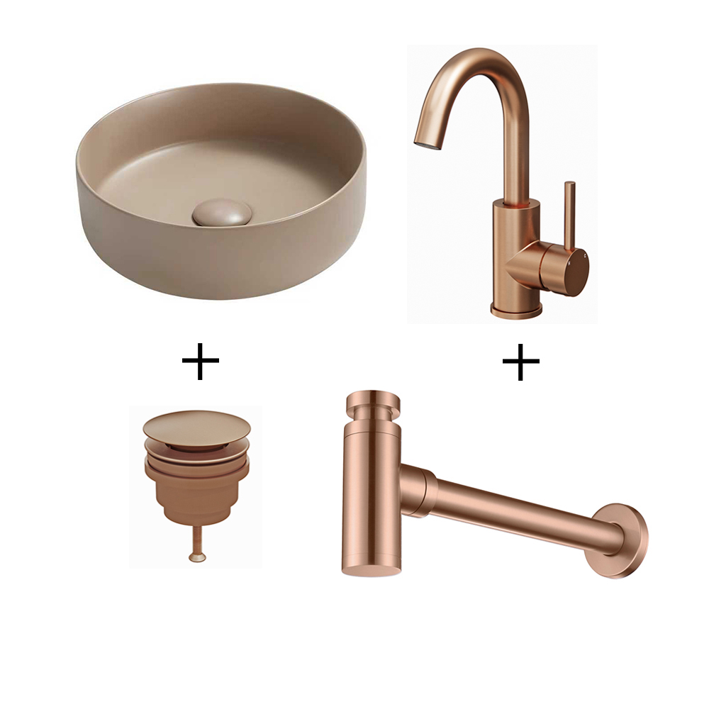 Wastafelset Anna 35x35x12cm mat beige inclusief wastafelkraan draaibaar, sifon en afvoerplug copper