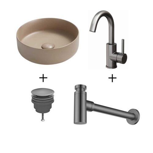 Wastafelset Anna 35x35x12cm mat beige inclusief wastafelkraan draaibaar, sifon en afvoerplug gun metal