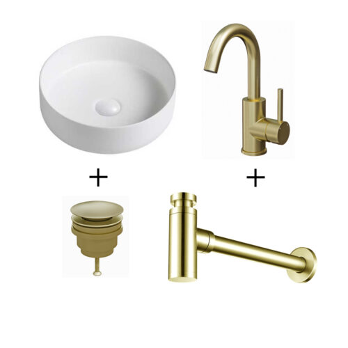 Wastafelset Anna 35x35x12cm mat wit inclusief wastafelkraan draaibaar, sifon en afvoerplug mat goud