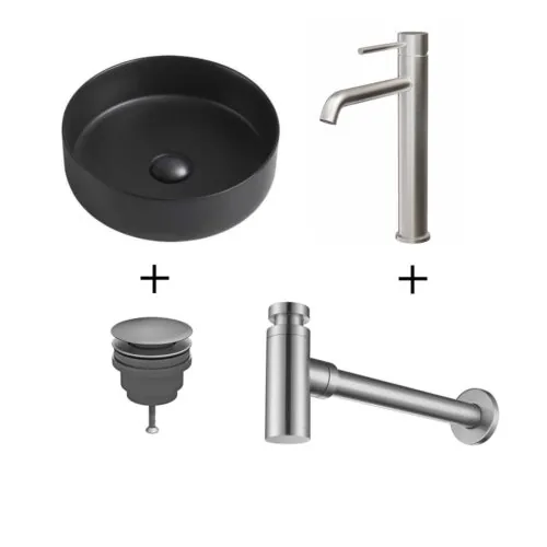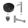 Wastafelset Anna 35x35x12cm mat zwart inclusief wastafelkraan hoog RVS, sifon en afvoerplug RVS