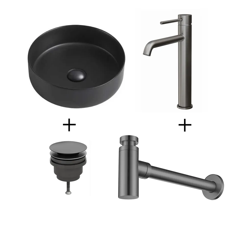 Wastafelset Anna 35x35x12cm mat zwart inclusief wastafelkraan hoog, sifon en afvoerplug gun metal
