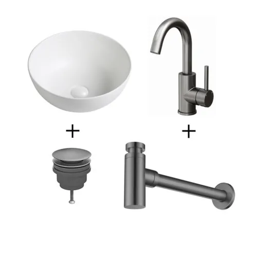 Wastafelset Verla 35x35x15cm mat wit inclusief wastafelkraan draaibaar, sifon en afvoerplug gun metal